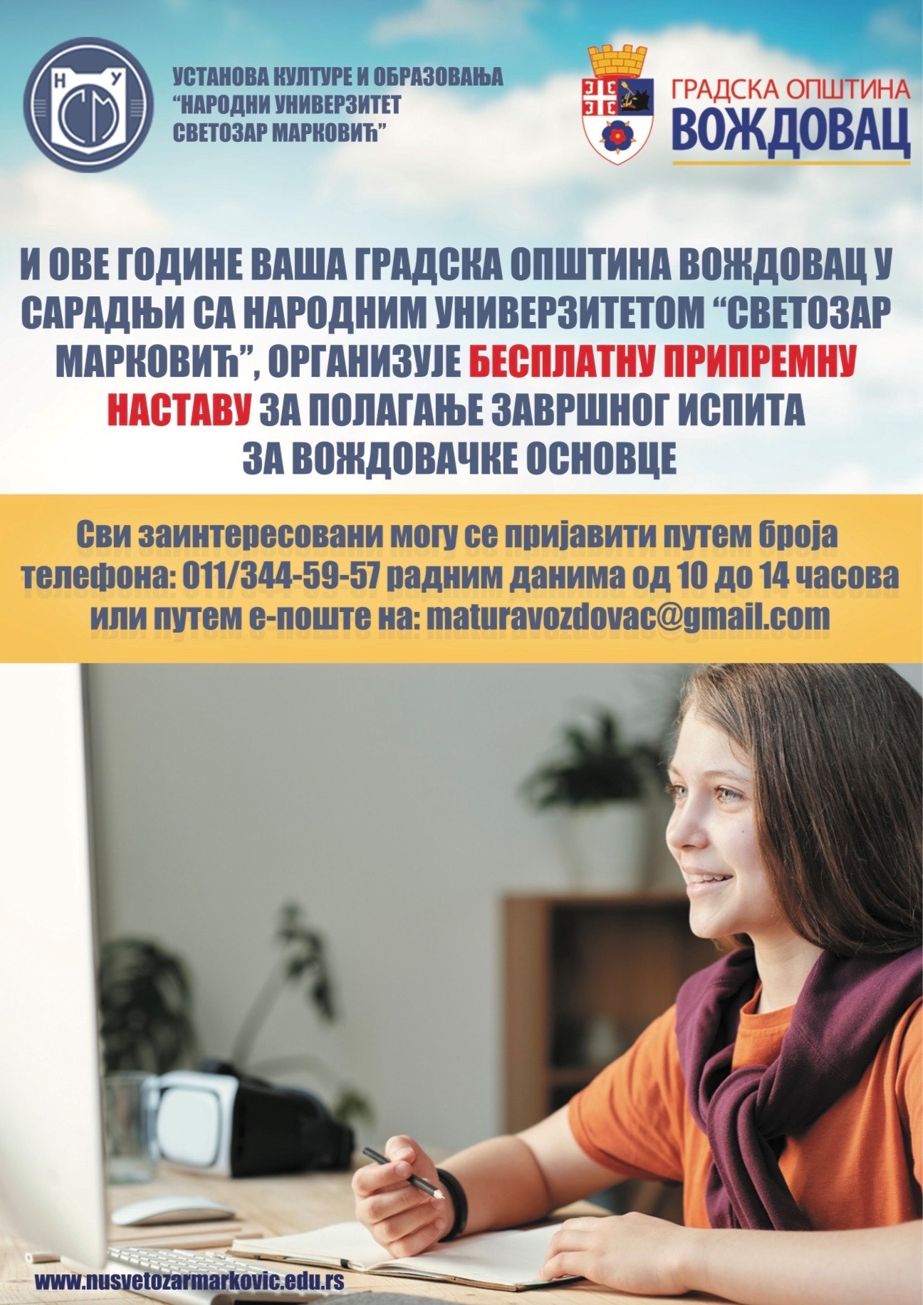 Градска општина Вождовац и Установа културе и образовања „Народни универзитет Светозар Марковић“ позивају ученике завршних разреда основних школа да се пријаве на бесплатне часове припреме за полагање завршног испита. Сви заинтересовани се могу пријавити слањем имејла на: maturavozdovac@gmail.com и телефоном 011/344-59-57, радним данима од 10:00 до 14:00 часова.